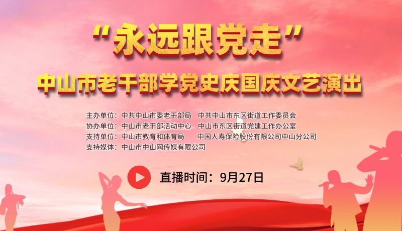 為深入學(xué)習(xí)貫徹習(xí)近平總書記“七一”重要講話精神,深化黨史學(xué)習(xí)教育成果,慶祝中華人民共和國成立72周年,展示新時代老干部的精神風(fēng)貌。市委老干部局和東區(qū)街道黨工委聯(lián)合主辦的“永遠跟黨走”中山市老干部學(xué)黨史慶國慶文藝演出于9月27日舉行,中山網(wǎng)將全程直播,敬請關(guān)注。