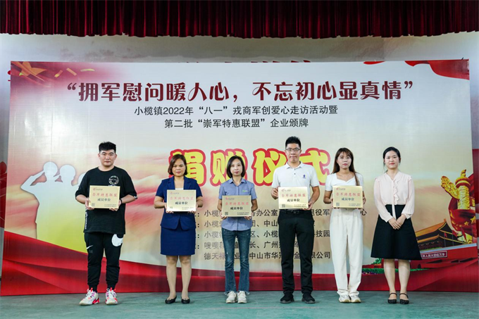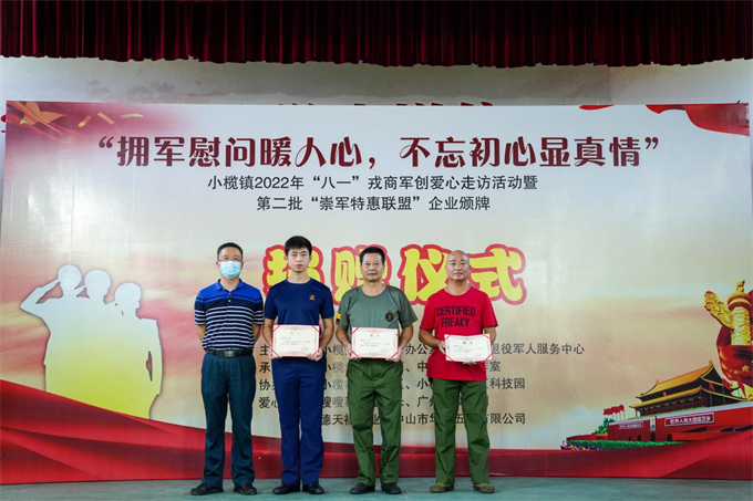 7月24日,小欖鎮(zhèn)舉行“擁軍慰問暖人心,不忘初心顯真情”——2022年“八一”愛心走訪活動啟動暨第二批“崇軍特惠聯盟”企業(yè)頒牌儀式。該鎮(zhèn)副鎮(zhèn)長鄧泳標、市退役軍人服務中心副主任高亞男及鎮(zhèn)公共服務辦、退役軍人服務中心、高沙社區(qū)、中山好人工作室相關負責人,小欖愛心助學團志愿者、愛心企業(yè)及第二批市“崇軍特惠聯盟”企業(yè)的代表以及部分優(yōu)秀退役軍人代表近100人參加了活動。