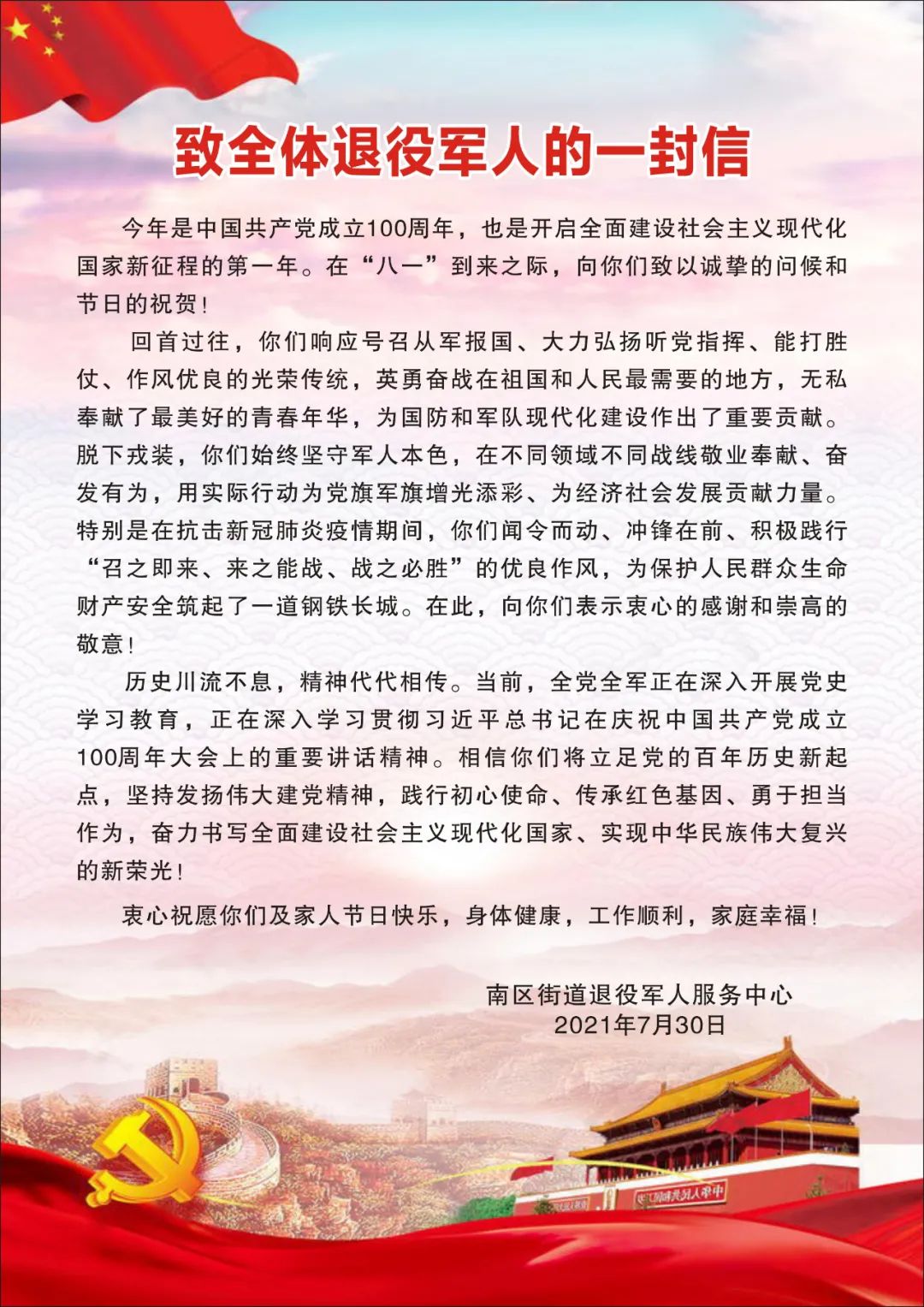 在“建軍節(jié)”來(lái)臨之際,南區(qū)街道開(kāi)展一系列擁軍優(yōu)屬活動(dòng),懷著崇敬之心、感恩之心,向優(yōu)撫對(duì)象和退役軍人、現(xiàn)役軍人家屬表達(dá)關(guān)懷和謝意,推動(dòng)軍民共建!