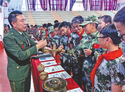 林東小學(xué)師生興致勃勃參觀移動(dòng)軍旅展覽館紅色收藏品。