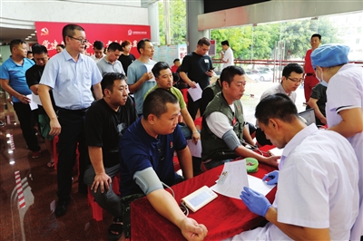我市退役軍人踴躍報(bào)名參加無償獻(xiàn)血活動,大家正在接受獻(xiàn)血前血壓測量。記者 王云 攝