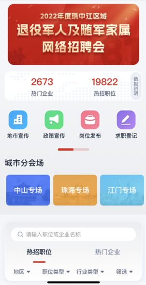 2022年度珠中江區(qū)域退役軍人及隨軍家屬網(wǎng)絡(luò)招聘會頁面。 主頁分設(shè)城市宣傳專區(qū)、政策宣傳專區(qū)、崗位發(fā)布入口、求職登記入口、求職訂閱服務(wù)、在線測評共六大功能板塊。 招聘會設(shè)置退役軍人就業(yè)指導(dǎo)員,根據(jù)就業(yè)及企業(yè)需求調(diào)研結(jié)果,對有求職意向的退役軍人和隨軍家屬提供精準(zhǔn)匹配及推送、政策咨詢、簡歷指導(dǎo)、崗位推薦等就業(yè)指導(dǎo)服務(wù)。 一、求職登記流程 1、求職登記 手機掃碼進(jìn)入【2022年度珠中江區(qū)域退役軍人及隨軍家屬網(wǎng)絡(luò)招聘會】,電腦端可通過文章左下方原文鏈接進(jìn)入專場。點擊【求職登記】即可登記,登記成功后,企業(yè)HR可以通過平臺與求職者聯(lián)系溝通。