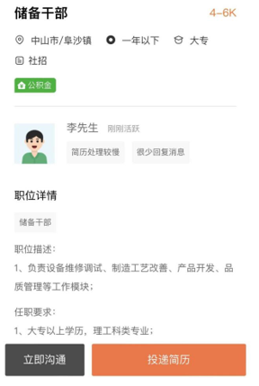▲求職者注冊流程 3、投遞簡歷 完善注冊信息后,即可跳轉(zhuǎn)至【2022年度珠中江區(qū)域退役軍人及隨軍家屬網(wǎng)絡(luò)招聘會】,點擊職位名稱可進(jìn)入相應(yīng)職位詳情頁,點擊企業(yè)可進(jìn)入企業(yè)詳情頁,可查看企業(yè)發(fā)布的在線職位。 點擊職位詳情頁左下方【立即溝通】可和HR進(jìn)行溝通,點擊右下方【投遞簡歷】即可完成投遞。