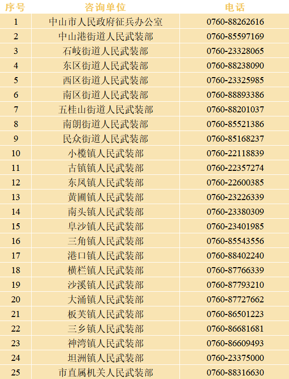 2025年全國征兵(男兵)應征報名已于12月1日開始。記者從中山市人民政府征兵辦公室獲悉,即日起,符合條件的青年可通過官方渠道報名參軍,對于征兵政策和流程存有疑問的市民,可通過撥打各鎮(zhèn)街征兵咨詢電話獲得詳細解答。 應征報名(男兵) 應征報名提示:男兵報名前須完成兵役登記 全國征兵(男兵)2025年應征報名時間 上半年應征報名:2024年12月1日至2025年2月10日24時 下半年應征報名:2024年12月1日至2025年8月10日24時 男兵應征報名對象 高中(含中專、職高、技校)畢業(yè)生及以上文化程度的青年(含高校在校生),年滿18至22周歲(2003年1月1日——2007年12月31日出生);普通高等學校本專科畢業(yè)生、上半年符合畢業(yè)條件的畢業(yè)班學生,年滿18至24周歲;研究生畢業(yè)生及在校生放寬至26周歲;初中畢業(yè)文化程度男青年,年滿18至20周歲。 應征報名(女兵) 全國征兵(女兵)2025年應征報名時間 上半年應征報名:2025年1月1日至2025年2月10日24時 下半年應征報名:2025年7月1日至2025年8月10日24時 女兵應征報名對象 上半年應征報名:普通高等學校和科研機構全日制應屆畢業(yè)生及在校生,年滿18至22周歲(2003年1月1日——2007年12月31日出生),全日制研究生應屆畢業(yè)生及在校生放寬至26周歲;2024年普通高等學校全日制本專科應屆畢業(yè)生可以報名參加2025年上半年女兵征集,年齡放寬至23周歲。 下半年應征報名:普通高中應屆畢業(yè)生、普通高等學校和科研機構全日制應屆畢業(yè)生及在校生,年滿18至22周歲(2003年1月1日——2007年12月31日出生),全日制研究生應屆畢業(yè)生及在校生放寬至26周歲。 報名方式 報名方式征兵報名官方網站:全國征兵網 www.gfbzb.gov.cn 軍隊媒體移動旗艦客戶端:中國軍號App 中山各鎮(zhèn)街征兵咨詢電話