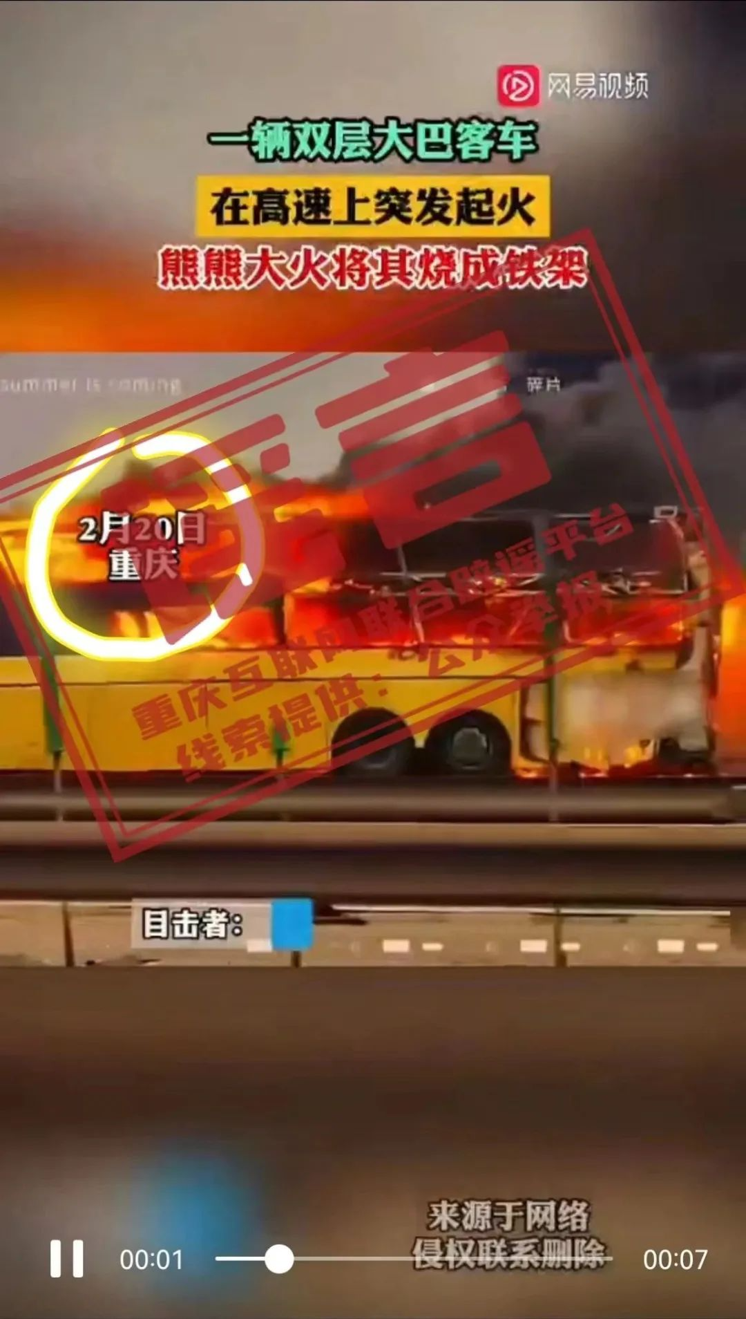 網(wǎng)傳視頻顯示高速上一輛大客車正燃著熊熊烈火,視頻配文稱“一輛雙層大巴客車在高速突發(fā)起火,熊熊大火將其燒成鐵架”,并在顯著位置標(biāo)示“2月20日 重慶”。