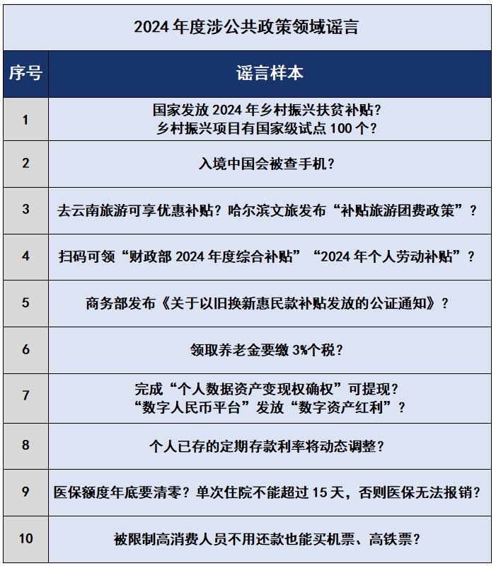 2024年3月,有不法分子冒用國家機(jī)關(guān)名義,假稱“國家發(fā)放2024年鄉(xiāng)村振興扶貧補(bǔ)貼”“鄉(xiāng)村振興項(xiàng)目有國家級(jí)試點(diǎn)100個(gè)”,以高額返利為誘餌,引誘大量不明真相的群眾加入所謂的各類“基金會(huì)”和“項(xiàng)目”,巧立名目騙取錢財(cái)。還有自媒體從公開發(fā)布的政策信息中摘取碎片化信息,斷章取義,對(duì)政策歪曲解讀。如2024年10月,個(gè)別自媒體故意混淆“個(gè)人養(yǎng)老金”與“基本養(yǎng)老金”的概念,傳播“領(lǐng)取養(yǎng)老金要繳3%個(gè)稅”“養(yǎng)老金個(gè)稅起征點(diǎn)為5000元”等不實(shí)信息,引發(fā)公眾誤解。此外,在《國家安全機(jī)關(guān)行政執(zhí)法程序規(guī)定》和《國家安全機(jī)關(guān)辦理刑事案件程序規(guī)定》公布之際,一些別有用心之人借機(jī)造謠抹黑、搬弄是非,大肆炮制所謂“入境中國都會(huì)被查手機(jī)”的謠言,荒謬至極。
