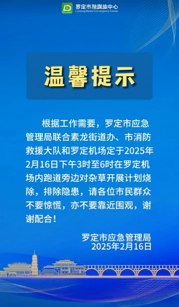 記者查詢發(fā)現(xiàn),羅定市融媒體中心曾于2月16日發(fā)布一則提示,明確表示羅定機(jī)場將于2025年2月16日下午3時至6時,在跑道旁開展雜草燒除工作,并提醒市民不必驚慌。