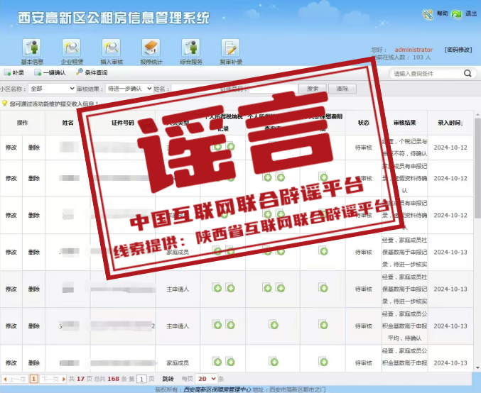 真相:近期,有不法分子偽造西安高新區(qū)公租房信息管理系統(tǒng)審核界面,在網(wǎng)絡(luò)上散布公租房資格審核虛假信息,引發(fā)關(guān)注。對此,西安高新區(qū)住房和城鄉(xiāng)建設(shè)局發(fā)布《關(guān)于警惕不法分子偽造虛假信息的聲明》稱,切勿輕信網(wǎng)絡(luò)、微信中發(fā)布的高新區(qū)公租房相關(guān)政策虛假信息及類似委托代辦信息,以避免個人經(jīng)濟、財產(chǎn)受到損失。高新區(qū)公租房資格審核全程不代辦、不收費,審核結(jié)果均以市級六部門聯(lián)審反饋結(jié)果為準(zhǔn)。同時,任何通過違規(guī)代辦以及提供虛假材料騙取公租房資格的,一經(jīng)發(fā)現(xiàn),將嚴(yán)肅查處,取消保障資格。(來源:陜西省互聯(lián)網(wǎng)聯(lián)合辟謠平臺)