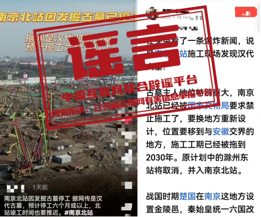真相:近日,有網(wǎng)民在網(wǎng)絡(luò)平臺(tái)發(fā)帖稱(chēng),南京北站因挖到古墓,“已經(jīng)被國(guó)家文物局要求禁止施工了”“預(yù)計(jì)停工六個(gè)月或以上”“施工工期已經(jīng)被拖到2030年”等。經(jīng)江蘇省互聯(lián)網(wǎng)辟謠平臺(tái)與省文物部門(mén)和屬地核實(shí),目前沒(méi)有收到國(guó)家文物局關(guān)于“南京北站禁止施工”的有關(guān)通知,南京北站除個(gè)別涉及考古發(fā)掘作業(yè)區(qū)域外,其他施工作業(yè)均按計(jì)劃正常有序推進(jìn),網(wǎng)傳信息系謠言。(來(lái)源:江蘇省互聯(lián)網(wǎng)辟謠平臺(tái)、“南京網(wǎng)絡(luò)辟謠”微信公眾號(hào))