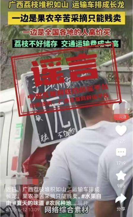 真相:6月12日,網傳“近日廣西荔枝堆積如山,運輸車排成長龍。果農辛苦采摘只能賤賣”的視頻,畫面顯示荔枝堆積和“靈山荔枝1元”字樣。經核查,視頻內容并非發(fā)生在靈山縣。目前,靈山荔枝“妃子笑”等中熟品種逐漸批量上市,大規(guī)模上市時間為6月20日左右,當前荔枝產銷有序開展,并未發(fā)現個別媒體報道的“荔枝滯銷賤賣”“采摘堆積成山”“運輸車排成長龍”的情況,也沒有發(fā)現價格低到1元的荔枝出售。(來源:“廣西互聯網違法和不良信息舉報”微信公眾號)